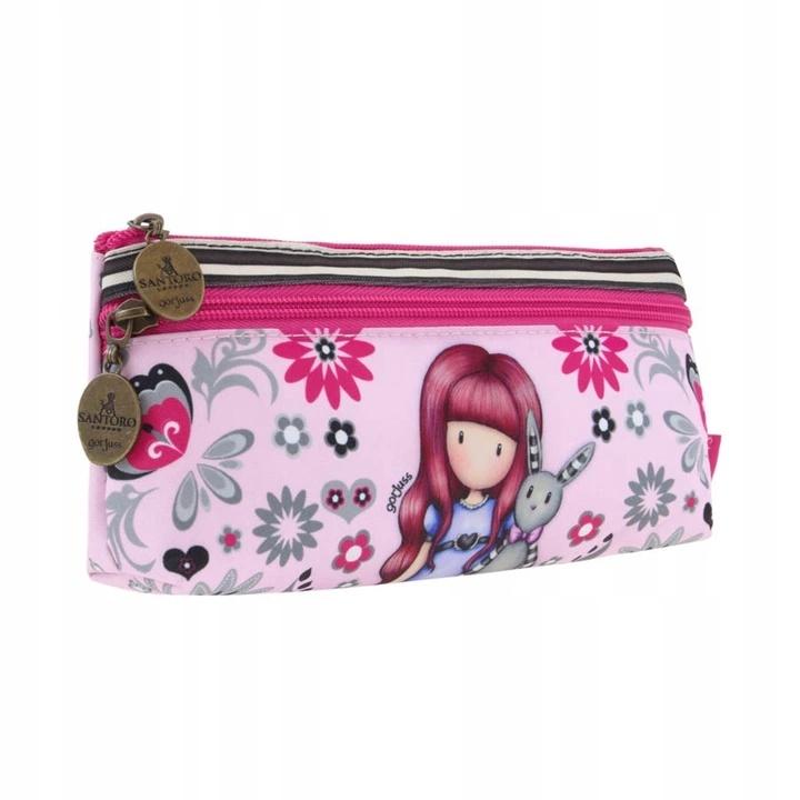 Piękny piórnik ozdobiony grafiką w odcieniach bzu i cukierkowego różu.