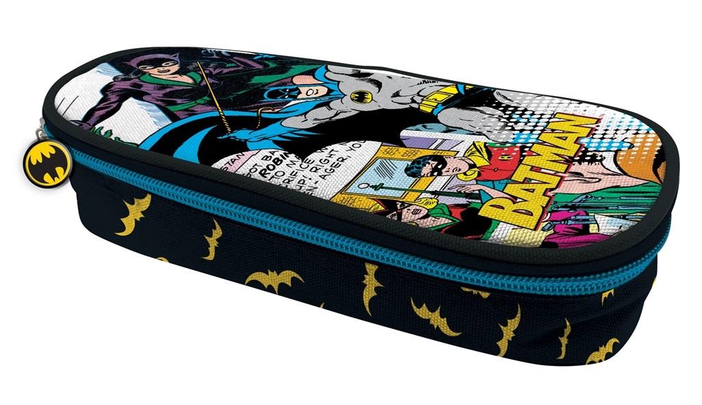 Owalny piórnik szkolny z klapką to niezbędny przedmiot uczniów. Wewnątrz na klapce znajdują się gumowe uchyty na przybory do pisania oraz skrzydło, na którym jest kieszonka z siateczki zamykana zamkiem błyskwicznym i kolejne gumowe uchwyty. Komora główna jest pojemna, korpus dodatkowo usztywniany. Na piórniku znajduje się motyw z serii Batman.
