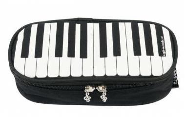 Piękny, pojemny piórnik w owalnym kształcie, zapinany na zamek, ozdobiony srebrnymi kluczami wiolinowymi. Na klapce motyw klawiatury.