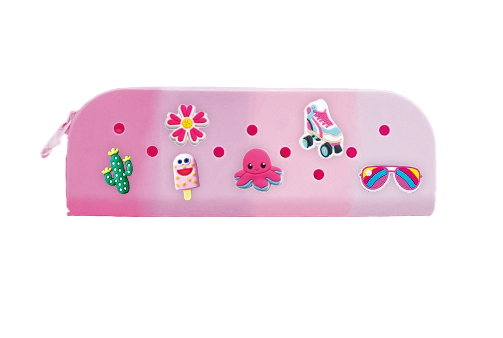 Silikonowy piórnik z kolorowymi wpinkami, to doskonałe miejsce na przechowywanie przyborów szkolnych. W zestawie znajduje się 6 wpinek, którymi można w dowolny sposób ozdabiać piórnik. Wpinki są wyjmowane, więc można się nimi wymieniać również z przyjaciółmi. Piórnik posiada jedną komorę, łatwo utrzymać w nim czystość, a zamek błyskawiczny gwarantuje, że niczego nie zgubimy. Nie zawiera wyposażenia.