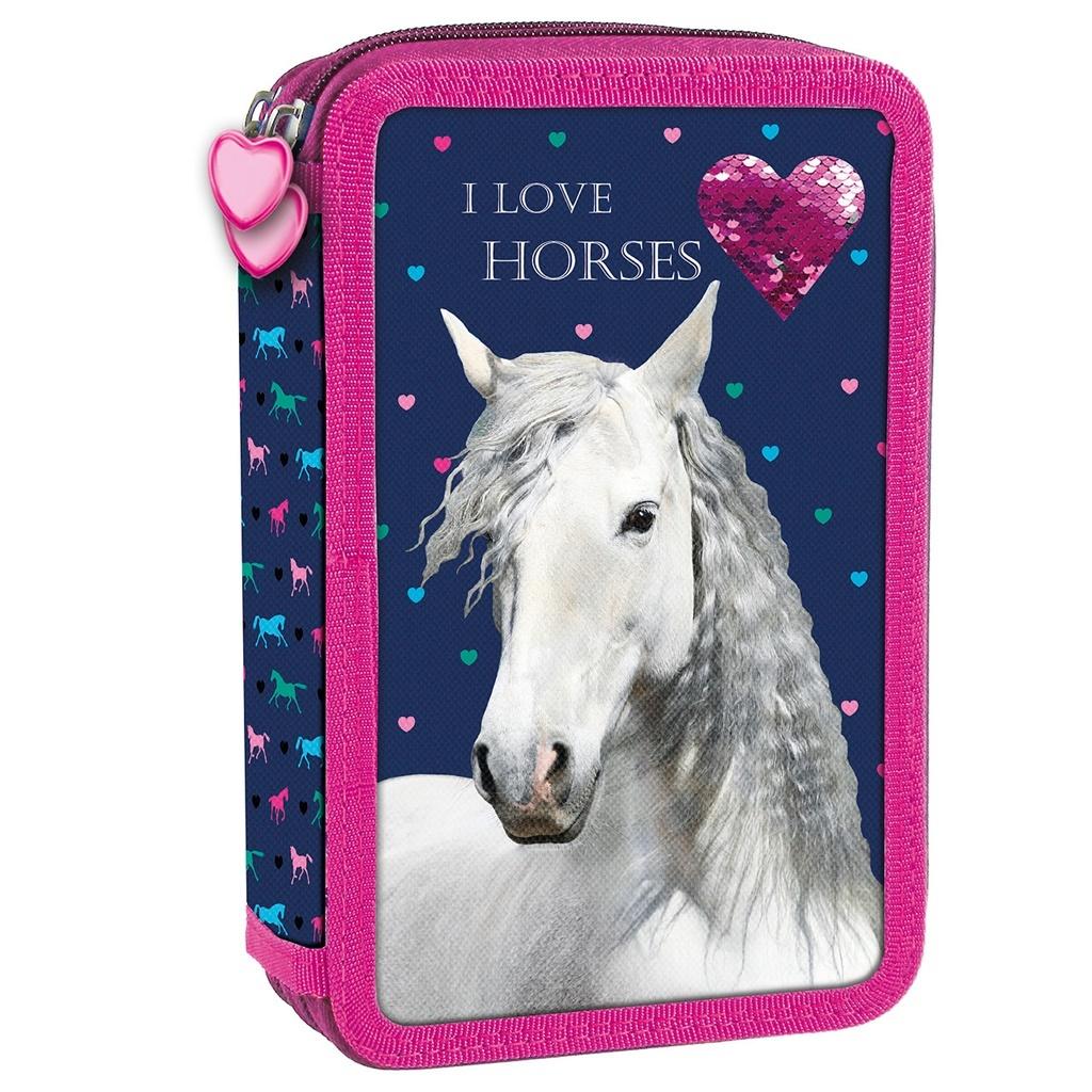 Piórnik dwukomorowy Konie z wyposażeniem zamykany na suwaki