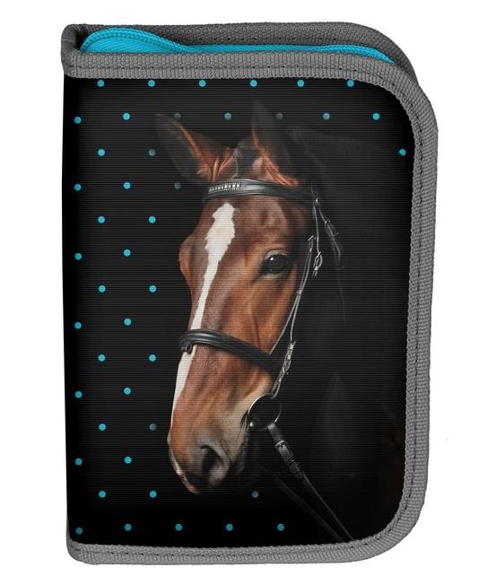 Piórnik jednokomorowy z dwoma klapkami z wyposażeniem (długopis, ołówek, 7 pisaków, 9 kredek, gumka, linijka, temperówka, ekierka). Zadrukowane kolorowe wnętrze.