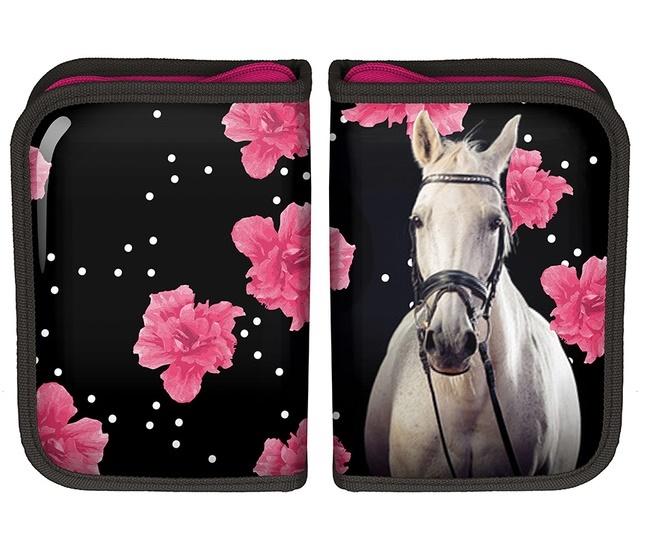 Piórnik jednokomorowy z dwoma klapkami z wyposażeniem (długopis, ołówek, 7 pisaków, 9 kredek, gumka, linijka, temperówka, ekierka). Zadrukowane kolorowe wnętrze.