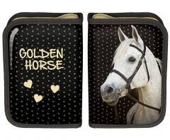 Piórnik jednokomorowy z dwoma klapkami z wyposażeniem (długopis, ołówek, 7 pisaków, 9 kredek, gumka, linijka, temperówka, ekierka). Zadrukowane kolorowe wnętrze.