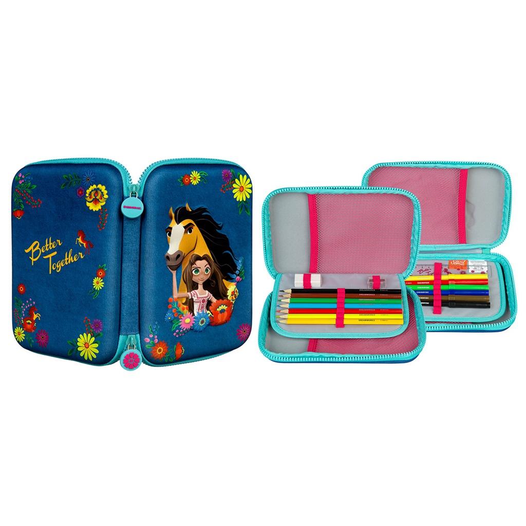 Dziecięcy piórnik z wyposażeniem, zamykany na suwak dwustronny z ozdobnymi, gumowymi zawieszkami. Odporny na zabrudzenia. Wykonany ze szczególną dbałością. Pojemny i praktyczny. Zaprojektowany w formie 3D z wizerunkami bohaterów z najnowszej bajki, Spirit Mustang Film, prezentuje się bardzo oryginalnie. Dzięki uroczym bohaterom szkoła może być fajna. Nieważne czy jesteś pierwszoklasistą czy piątoklasistą - potrzebujesz przyborów do szkolnej przygody.