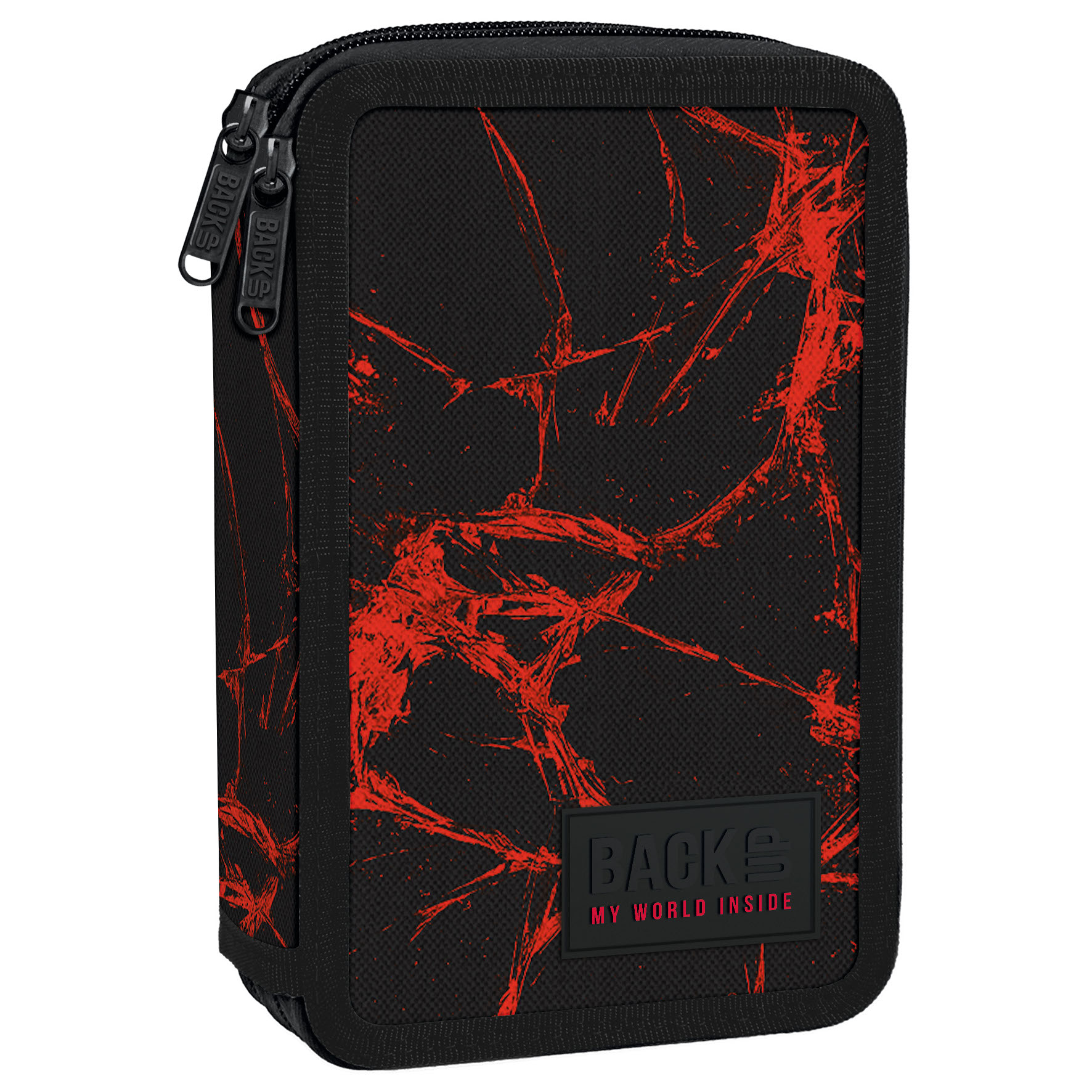 Czerwona sieć spowija intensywną czerń materiału. Rubinowe nici okalają piórnik młodzieżowy, spływając po nim niczym jad najgroźniejszego pająka. Dodatki w postaci czarnych suwaków i zamków dodają mrocznego wyrazu. To piórnik dla chłopca, który chce pokazać siłę swego charakteru. Dwukomorowy piórnik BackUP z wyposażeniem posiada: