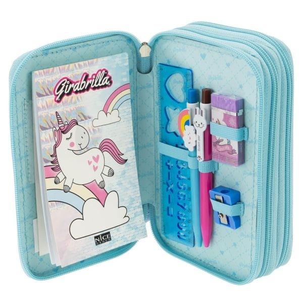 Piórnik posiada trzy przedziały, z zamkami błyskawicznymi, pokrytymi miękką, opalizującą, wodoodporną tkaniną ozdobioną jednorożcem z odwracalnymi cekinami.
