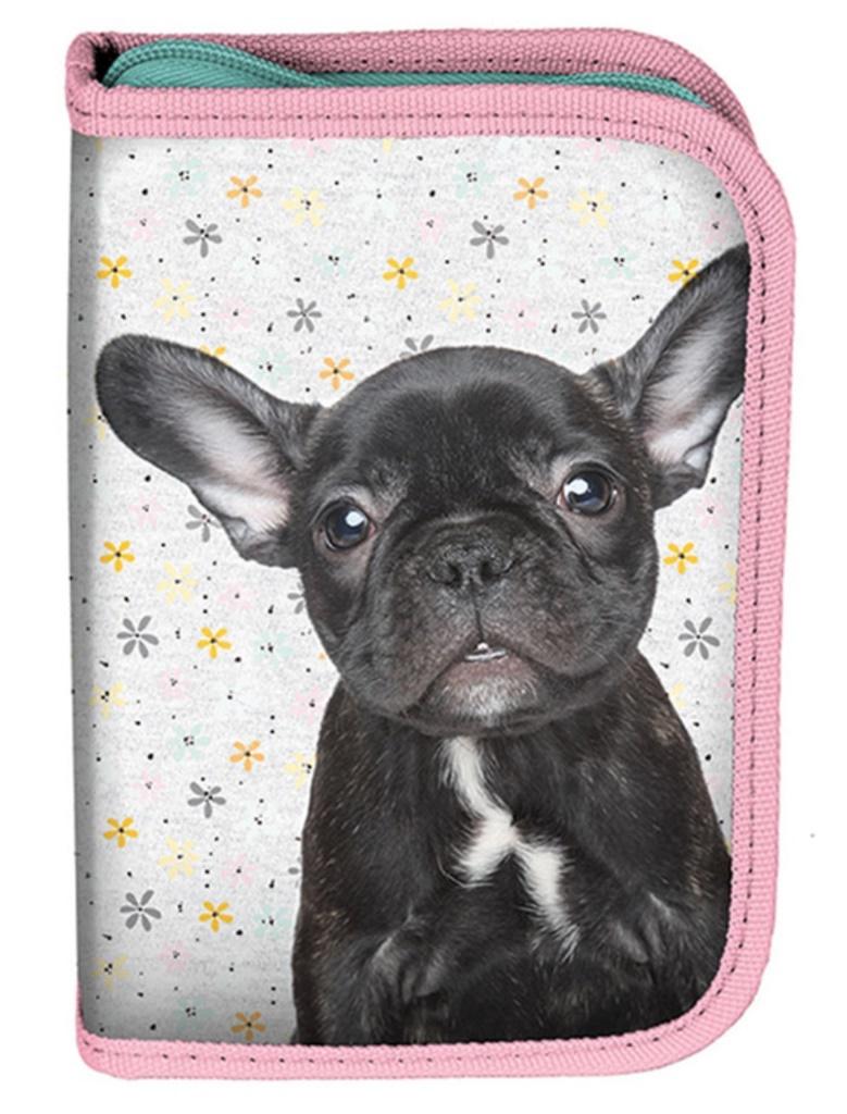 Piórnik jednokomorowy z dwoma klapkami z wyposażeniem (długopis, ołówek, 7 pisaków, 9 kredek, gumka, linijka, temperówka, ekierka). Zadrukowane kolorowe wnętrze.