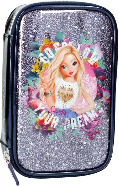 Piórnik Top Model wykonany został z dbałością o każdy szczegół. Prezentuje się bardzo modnie. Przednia ścianka piórnika ozdobiona jest brokatowym wzorem w kolorze srebrnym. Produkt posiada jedną komorę a w środku jest podzielony na dwie części. Piórnik jest bardzo pojemny, wewnątrz znajduje się także miejsce na inne akcesoria lub przybory szkolne. Wyposażenie piórnika:1x temperówka do grubych i cienkich ołówków1x gumka1x klej w sztyfcie1x gruby ołówek1x cienki ołówek1x linijka 15 cm8 różnych kredek8 różnych różnokolorowych pisaków Wiek: Od 3 lat+Wymiary produktu: 21 x 14 x 5,5 cmKolor: Granatowy