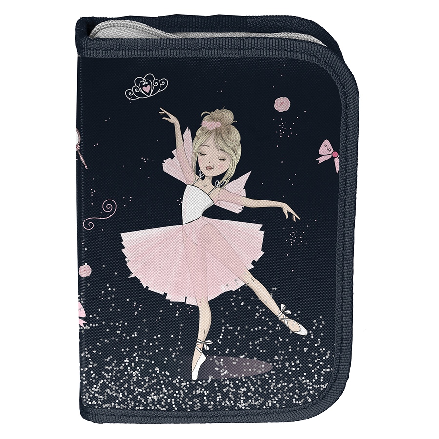 Piórnik jednokomorowy z dwoma klapkami z wyposażeniem (długopis, ołówek, 7 pisaków, 9 kredek, gumka, linijka, temperówka, ekierka). Zadrukowane kolorowe wnętrze.