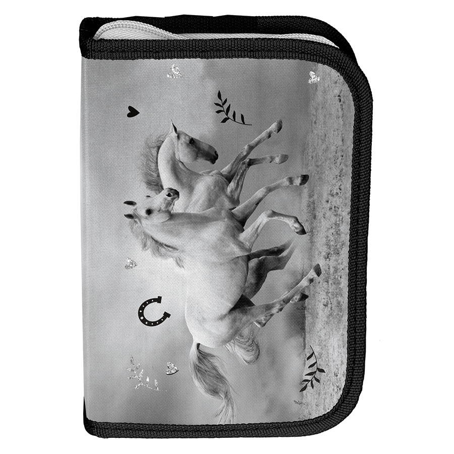 Piórnik jednokomorowy z dwoma klapkami z wyposażeniem (długopis, ołówek, 7 pisaków, 9 kredek, gumka, linijka, temperówka, ekierka). Zadrukowane kolorowe wnętrze.