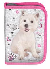 Piórnik z wyposażeniem Dog love. Zawartość: długopis ołówek 9 kredek ołówkowych 7 pisaków linijka, ekierka gumka, temperówka.