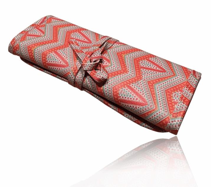 piórnik zawijany, wykonany z ekoskóry w oryginalnej kolorystyce zawiązywany wnętrze piórnika wyszyte jest przegródkami różnej szerokości idealny zarówno jako piórnik który pomieści wiele przyborów do pisania jak i etui na pędzle dla dziewcząt uwielbiających wizaż