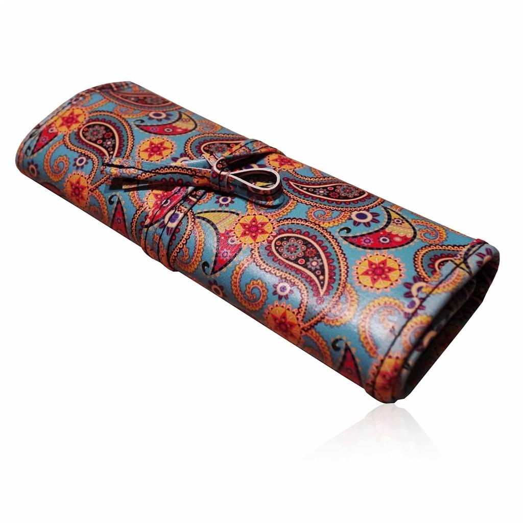 Piórnik zawijany, wykonany z ekoskóry, w oryginalnej kolorystyce, zawiązywany, wnętrze piórnika wyszyte jest przegródkami różnej szerokości, idealny zarówno jako piórnik który pomieści wiele przyborów do pisania jak i etui na pędzle dla dziewcząt uwielbiających wizaż