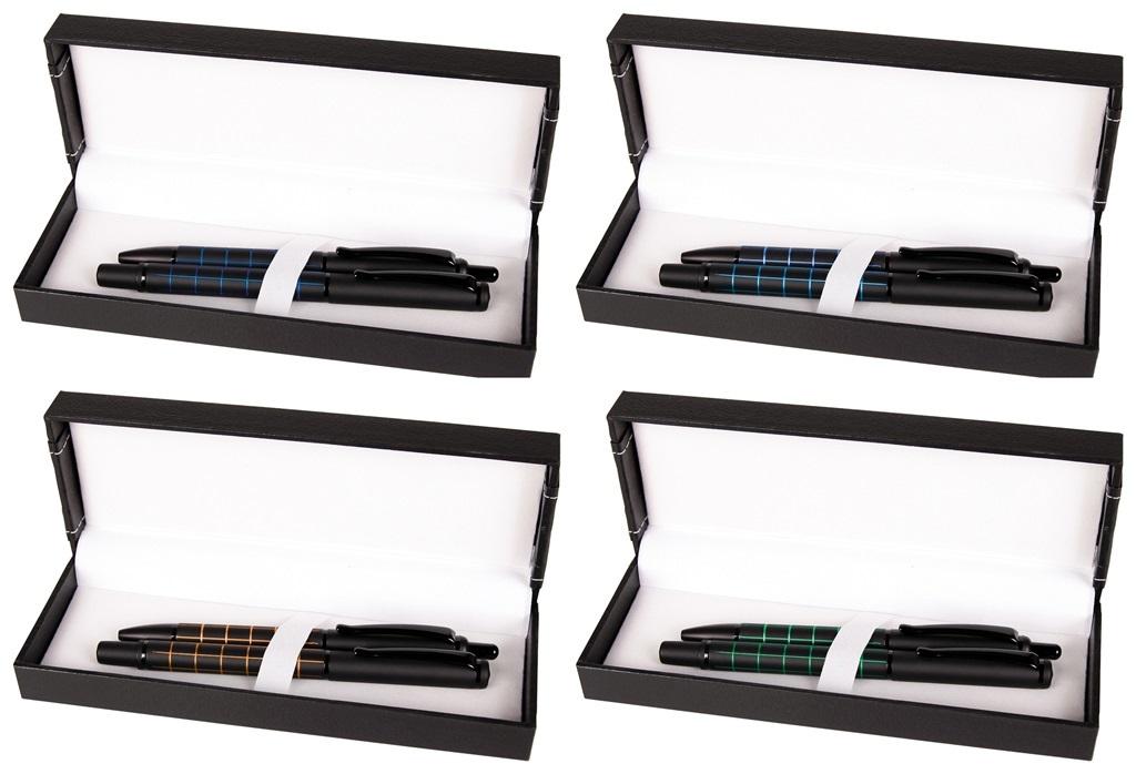 Model zestawu piśmiennego DORIAN w ponadczasowej, czarnej kolorystyce z kolorową kratą. Kolekcja obejmuje pióro wieczne ze stalówką irydową oraz długopis. Pióro wieczne ze stalówką irydową zasilane standardowymi nabojami atramentowymi. Długopis posiada pstrykany system wysuwania wkładu wielkopojemnościowego typu Zenith. Komplet zapakowany w skóropodobne etui prezentowe 38.