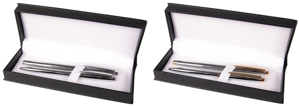 Nowoczesna kolorystyka chromu z wykończeniami srebrnymi oraz złotymi. Pióro zasilane standardowymi nabojami atramentowymi z stalówką irydową, długopis natomiast posiada przyciskowy system wysuwania wkładu wielko pojemnościowego.