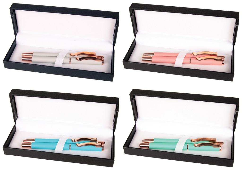 Model zestawu piśmiennego MASTER w atrakcyjnej kolorystyce ze złotymi wykończeniami. Kolekcja obejmuje pióro wieczne ze stalówką irydową oraz długopis. Pióro wieczne ze stalówką irydową zasilane standardowymi nabojami atramentowymi. Długopis posiada pstrykany system wysuwania wkładu wielkopojemnościowego typu Zenith. Komplet zapakowany w eleganckie etui skóropodobne 38.