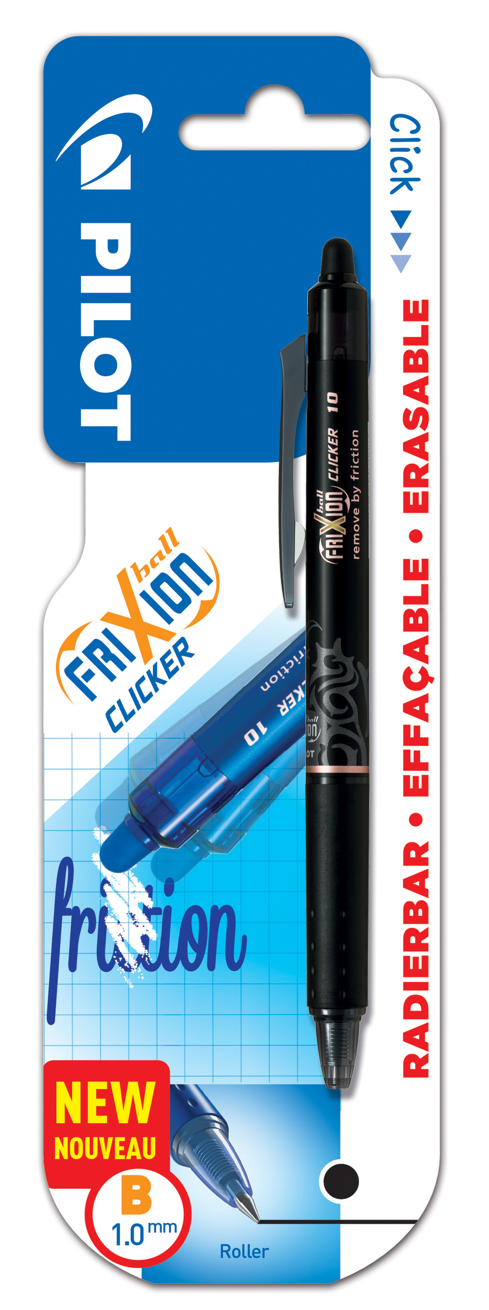Czarne pióro kulkowe FriXion Clicker na blistrze, o rozmiarze końcówki piszącej 1.0. Pisz płynnie szeroką końcówką, wymaż silikonową gumką FriXion i zacznij od nowa! Bestseller marki Pilot pozwala na czyste pisanie i usuwanie atramentu poprzez pocieranie - wszystko za pomocą tego samego pisaka. Unikalny żelowy atrament reaguje na ciepło generowane przez pocieranie i pozwala natychmiast poprawić swój błąd! Końcówka 1,0 mm zapewnia szeroką linię pisania 0,5 mm.