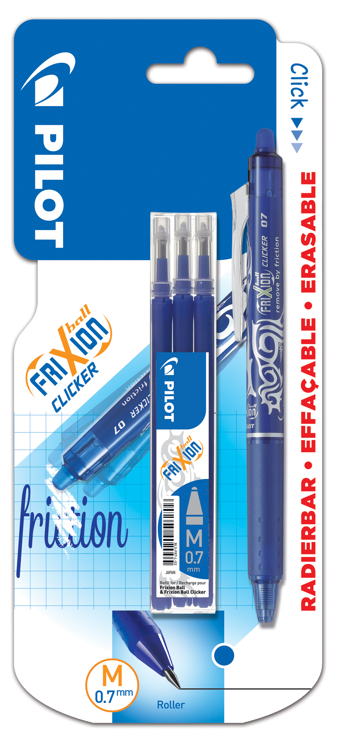 Niebieskie pióro kulkowe FriXion Clicker na blistrze, o rozmiarze końcówki piszącej 0.7, z 3 dodatkowymi wkładami. Pisz płynnie szeroką końcówką, wymaż silikonową gumką FriXion i zacznij od nowa! Bestseller marki Pilot pozwala na czyste pisanie i usuwanie atramentu poprzez pocieranie - wszystko za pomocą tego samego pisaka. Unikalny żelowy atrament reaguje na ciepło generowane przez pocieranie i pozwala natychmiast poprawić swój błąd!