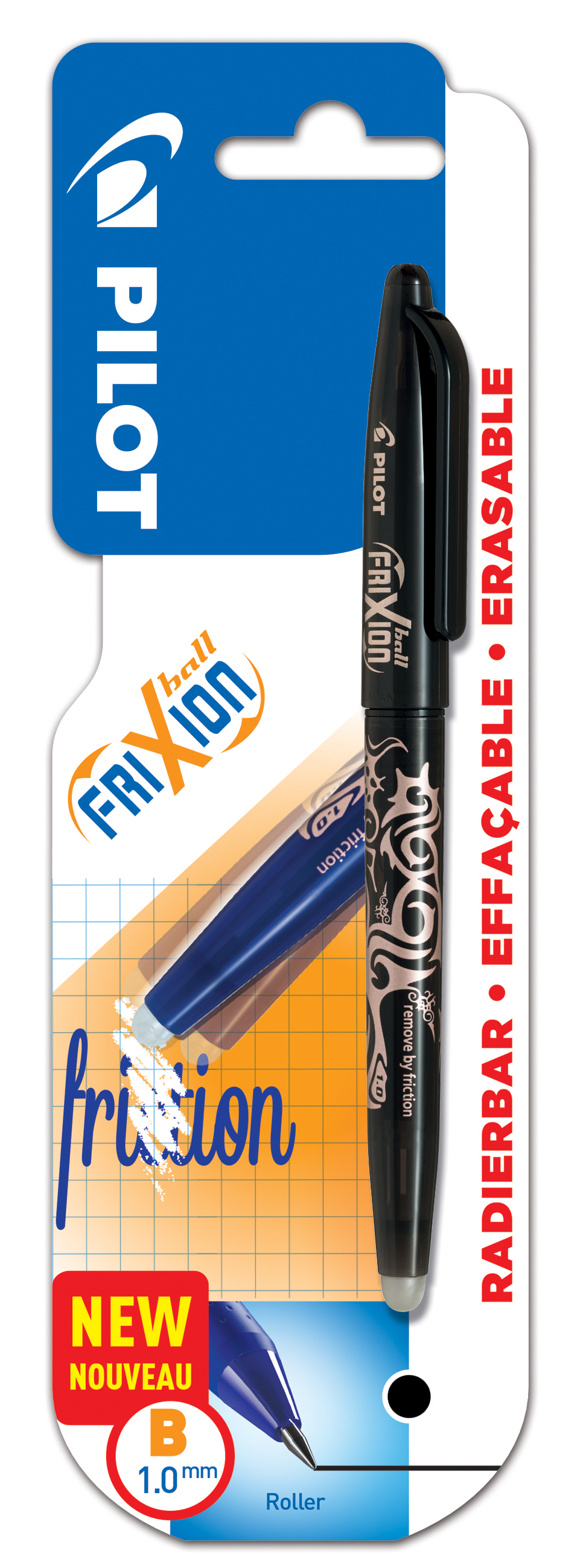 Czarny FriXion Ball na blistrze, o rozmiarze końcówki piszącej 1.0. Pisz płynnie szeroką końcówką, wymaż silikonową gumką FriXion i zacznij od nowa! Bestseller marki Pilot pozwala na czyste pisanie i usuwanie atramentu poprzez pocieranie - wszystko za pomocą tego samego pisaka. Unikalny żelowy atrament reaguje na ciepło generowane przez pocieranie i pozwala natychmiast poprawić swój błąd! Końcówka 1,0 mm zapewnia szeroką linię pisania 0,5 mm.