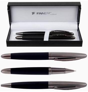 Zestaw metalowego długopisu i rollera, mechanizm obrotowy, wymienny wkład F-Parker, grubość linii 0,7 mm (długopis), wkład ceramiczny, grubość linii 0,5 mm (roller), niebieski kolor tuszu, luksusowe pudełko upominkowe.