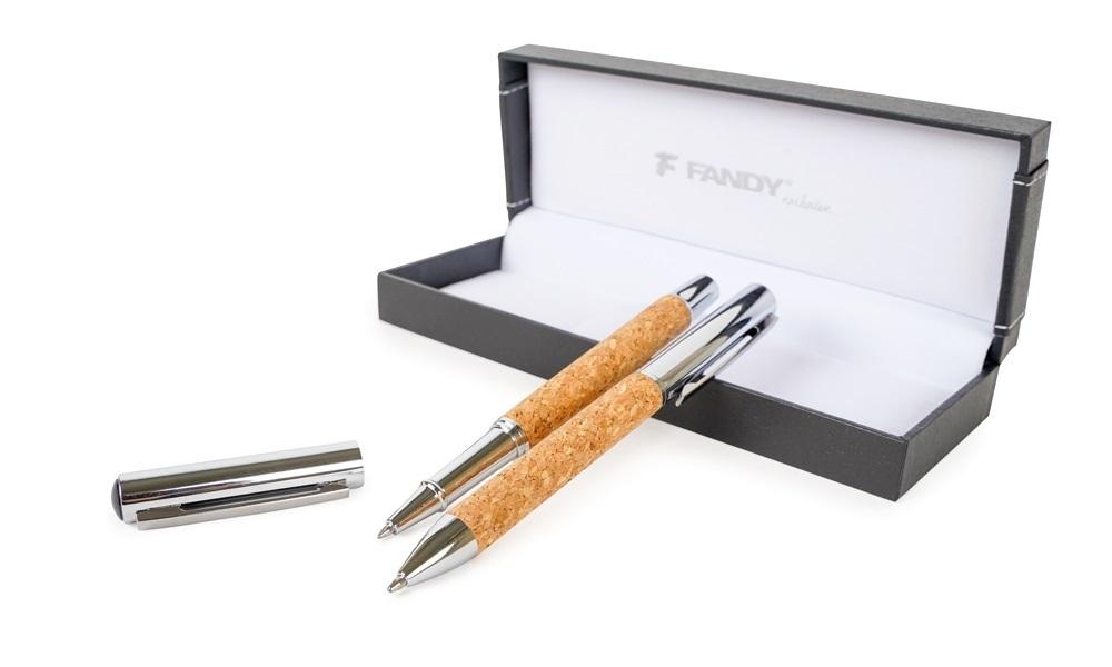 zestaw metalowego długopisu oraz rolleru, uchwyt wykonany z korku, długopis z mechanizmem obrotowym, roller z wieczkiem, wymienny wkład F-Parker, grubość linii 0,7 mm (długopis), Ceramika, grubość linii 0,5 mm (roller), tusz w kolorze niebieskim, luksusowe pudełko