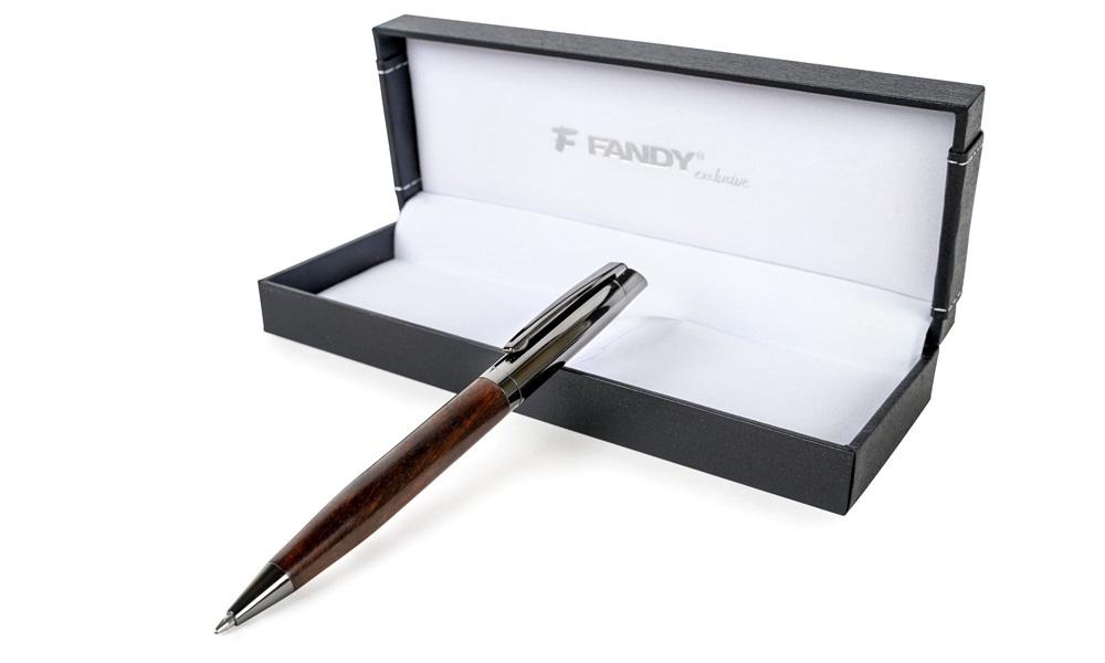 metalowy długopis, uchwyt wykonany z drewna, mechanizm obrotowy, wkład wymienny F-Parker, grubość linii 0,7 mm, niebieski kolor tuszu, luksusowe pudełko
