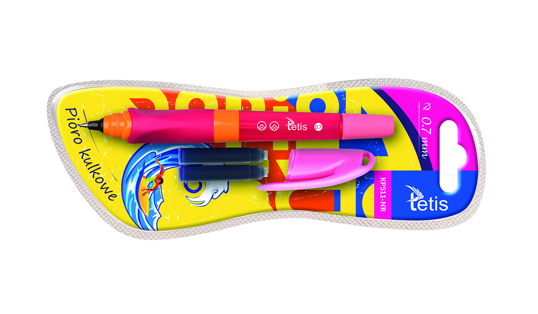 Pióro kulkowe posiadające specjalnie wyprofilowany, miękki, gumowy uchwyt oraz zapasowe naboje w komplecie (2 sztuki).