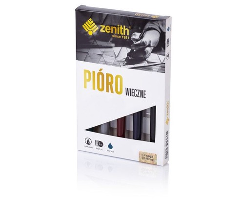 Stylowe pióro wieczne z nowym, eleganckim wykończeniem. Klips, stalówka oraz obrączka korpusu pokryte wysokiej jakości powłoką niklową, stalówka zakończona irydową kulką dla zapewnienia doskonałej jakości i łatwości pisania, wymienne naboje atramentowe Zenith. 5 sztuk w pudełku, mix kolorów.
