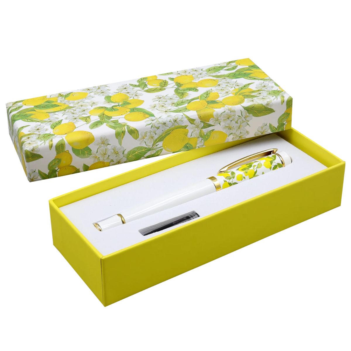 Doskonale wyważone pióro wieczne marki Peter Pauper Press Cytryny z Amalfi (Amalfi Lemons). Posiada irydową stalówkę, która zapewnia trwałość, lekkość pisania i płynny przepływ tuszu. Pióro posiada wielorazowy nabój z tłokiem (zwany konwerterem) do ładowania ulubionego tuszu, ale można też używać naboi jednorazowych - pierwszy jest dołączony do zestawu. Lakierowana konstrukcja z mosiądzu zapewnia solidność i wytrzymałość. Pióro jest zapakowane w gustowne pudełko zdobione tym samym wzorem.