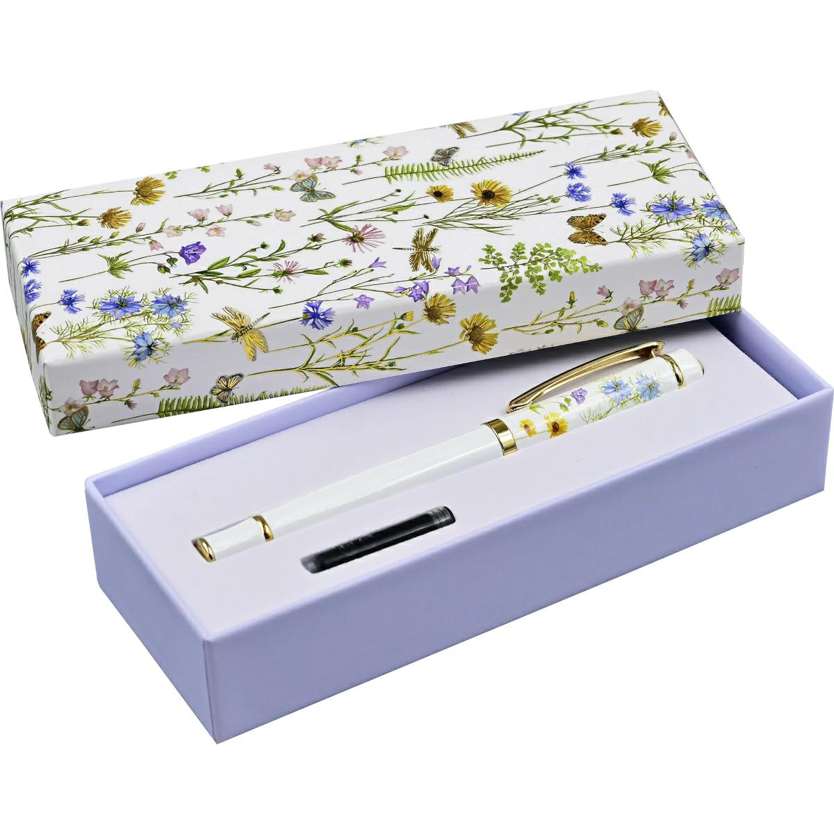 Doskonale wyważone pióro wieczne marki Peter Pauper Press Dziki Ogród (Wildflower Garden). Posiada irydową stalówkę, która zapewnia trwałość, lekkość pisania i płynny przepływ tuszu. Pióro posiada wielorazowy nabój z tłokiem (zwany konwerterem) do ładowania ulubionego tuszu, ale można też używać naboi jednorazowych - pierwszy jest dołączony do zestawu. Lakierowana konstrukcja z mosiądzu zapewnia solidność i wytrzymałość. Pióro jest zapakowane w gustowne pudełko zdobione tym samym wzorem.