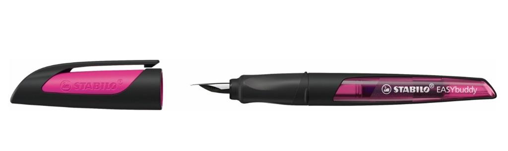 STABILO EASYbuddy to pióro wieczne zaprojektowane z myślą o dzieciach i młodzieży. Posiada uniwersalny, ergonomiczny uchwyt wykonany z materiału antypoślizgowego. Jest bardzo wygodne, dzięki czemu dłoń nie męczy się podczas pisania. Specjalne okienko pozwala kontrolować stopień zużycia naboju. Posiada stalówkę typu M. Dostępny jest w 13 kombinacjach kolorystycznych. Kolor czarny/różowy.