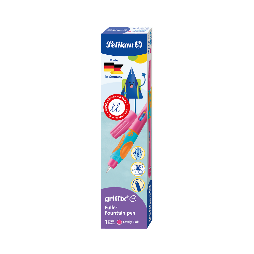 Dwie wersje: dla dzieci prawo i leworęcznych. Odporna na nacisk stalówka ze stali nierdzewnej. Duże okienko na atrament w obudowie pióra wiecznego zapewnia optymalną kontrolę poziomu atramentu.
