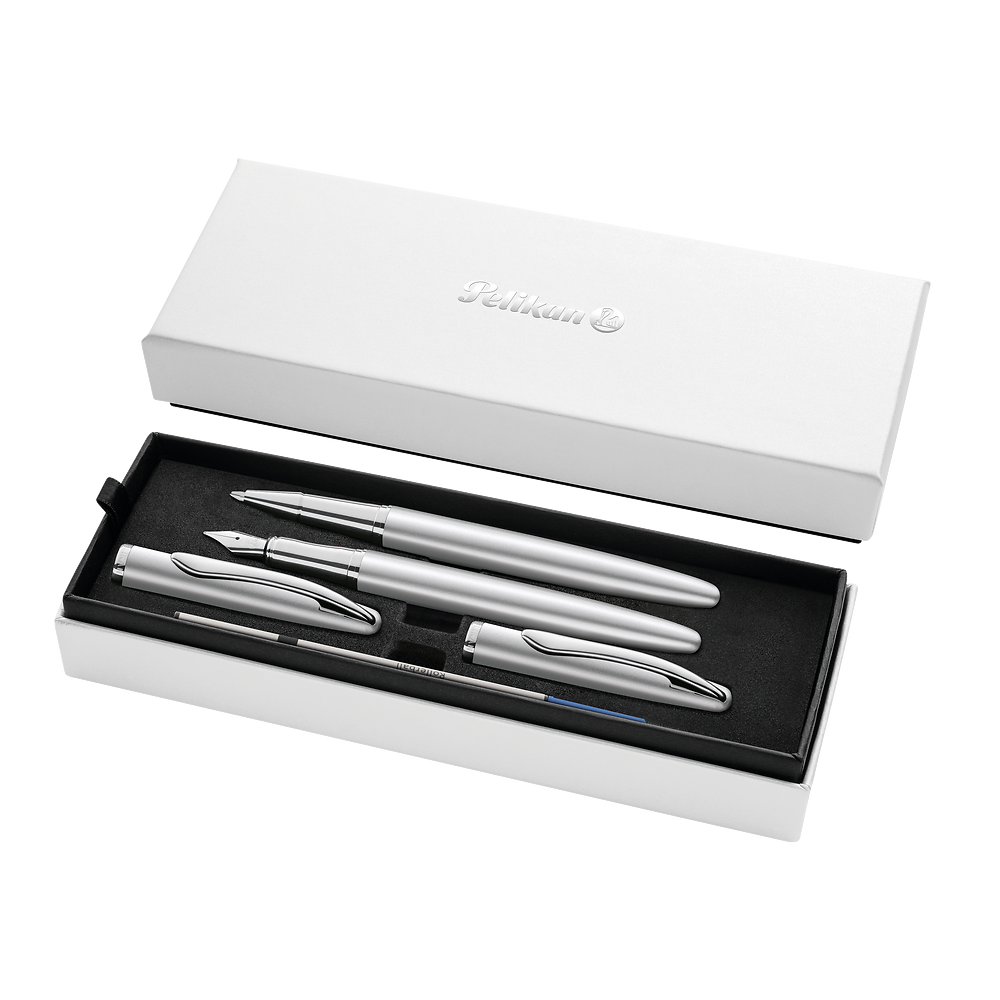 Zestaw Pelikan Jazz Noble Elegance łączy ponadczasowy styl i praktyczną funkcjonalność zawiera pióro wieczne oraz pióro kulkowe, które razem tworzą idealne narzędzie dla miłośników komfortowego pisania. Oba instrumenty mają metalową obudowę z subtelnym, perłowym wykończeniem, a wszystkie ich części są w 100% przystosowane do recyklingu. Stalówka pióra wiecznego (rozmiar M) gwarantuje płynny ruch po papierze, natomiast pióro kulkowe zapewnia wygodę i szybkość pisania dzięki zastosowaniu nabojów atramentowych kulkowych. Charakterystyczny sprężynowy klips w kształcie dziobu pelikana oraz dopracowane detale czynią ten zestaw nie tylko funkcjonalnym, ale i niezwykle stylowym idealnym na prezent lub do codziennego użytku.