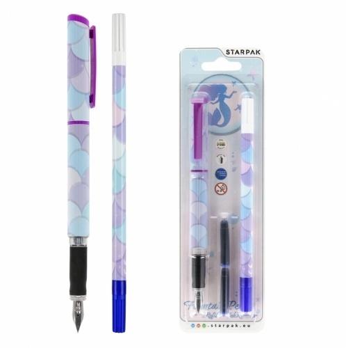 Pióro wieczne Syrenka STARPAK o kształcie dostosowanym do dłoni dziecka, z wytrzymałą stalówką, wykonaną z wysokiej jakości materiału. Specjalnie wyprofilowana, antypoślizgowa strefa uchwytu zapewnia komfort i pomaga w nauce pisania Twojego dziecka. Zapoznaj się również z innymi produktami dedykowanymi biurze i szkole! W piórze znajduje się miejsce na zapasowy wkład, dzięki czemu Twojemu dziecku nigdy nie zabraknie atramentu w trakcie pisania. Całość została ozdobiona elegancką grafiką Syrenka. W zestawie dwa naboje wymienne i dwustronny wymazywacz w pisaku. Końcówka wymazująca oznaczona białą zakrętką skutecznie usuwa błędy, a końcówka korygująca oznaczona niebieską zakrętką pozwala na poprawę błędów. Wymazywacz również został ozdobiony nadrukiem Syrenka, dzięki czemu tworzy komplet z piórem wiecznym. Wykonane z trwałego materiału. Zestaw pakowany na blistrze. Produkt nieodpowiedni dla dzieci poniżej 3 lat. Wymiary produktu (pióro) 13 cm, (wymazywacz) 17 cm. Wymiary opakowania (wys. x szer. x gł.) [cm]: 23x7x2 Waga opakowania (kg.) 0,03kg.