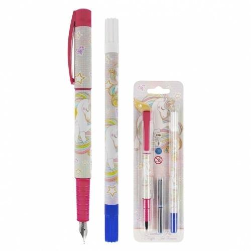 Pióro wieczne Unicorn STARPAK o kształcie dostosowanym do dłoni dziecka, z wytrzymałą stalówką, wykonaną z wysokiej jakości materiału. Specjalnie wyprofilowana, antypoślizgowa strefa uchwytu zapewnia komfort i pomaga w nauce pisania Twojego dziecka. Zapoznaj się również z innymi produktami dedykowanymi biurze i szkole! W piórze znajduje się miejsce na zapasowy wkład, dzięki czemu Twojemu dziecku nigdy nie zabraknie atramentu w trakcie pisania. Całość została ozdobiona elegancką grafiką. W zestawie dwa naboje wymienne i dwustronny wymazywacz w pisaku. Końcówka wymazująca oznaczona białą zakrętką skutecznie usuwa błędy, a końcówka korygująca oznaczona niebieską zakrętką pozwala na poprawę błędów. Wymazywacz również został ozdobiony eleganckim nadrukiem, dzięki czemu tworzy komplet z piórem wiecznym. Wykonane z trwałego materiału.