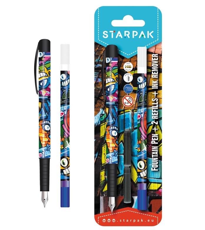 Pióro wieczne Starpak o kształcie dostosowanym do dłoni dziecka, z wytrzymałą stalówką, wykonaną z wysokiej jakości materiału. Specjalnie wyprofilowana, antypoślizgowa strefa uchwytu zapewnia komfort i pomaga w nauce pisania Twojego dziecka. Zapoznaj się również z innymi produktami dedykowanymi biurze i szkole! W piórze znajduje się miejsce na zapasowy wkład, dzięki czemu Twojemu dziecku nigdy nie zabraknie atramentu w trakcie pisania. Całość została ozdobiona nadrukiem w Graffiti. W zestawie dwa naboje wymienne i dwustronny wymazywacz w pisaku. Końcówka wymazująca oznaczona białą zakrętką skutecznie usuwa błędy, a końcówka korygująca oznaczona niebieską zakrętką pozwala na poprawę błędów. Wymazywacz również został ozdobiony nadrukiem w Graffiti, dzięki czemu tworzy komplet z piórem wiecznym. Wykonane z trwałego materiału. Zestaw pakowany na blistrze. Produkt nieodpowiedni dla dzieci poniżej 3 lat. Wymiary produktu (pióro) 13 cm, (wymazywacz) 17 cm. Wymiary opakowania(wys.x szer. x gł.) [cm]: 23x7x1.