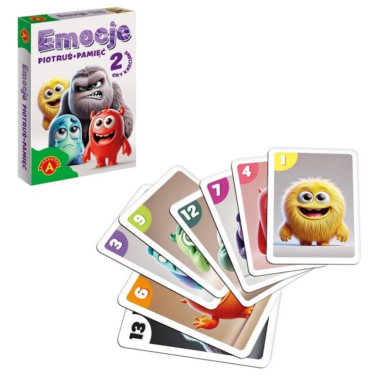 Piotruś Emocje to nie tylko klasyczna gra karciana, ale także wspaniała okazja, aby rozmawiać z dzieckiem o emocjach. Zestaw zawiera 25 kart z wizerunkami zabawnych stworków będących personifikacją 13 różnych emocji takich jak: Ekscytacja, Smutek, Zmęczenie, Spokój, Złość, Radość, Wstyd, Zainspirowanie, Ciekawość, Zachwyt, Duma, Wstręt i Wściekłość.