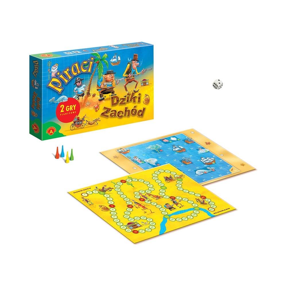 "Piraci" i "Dziki zachód" to dwie gry planszowe, oparte na bardzo prostych zasadach. W tych grach wygrywa ten, kto pierwszy kto pierwszy postawi swój pionek na ostatnim polu trasy. Po drodze gracze napotykają na wiele trudności i przeszkód. Dzięki temu gra jest bardzo emocjonująca i zapewnia doskonałą zabawę nie tylko dla dzieci. Zawartość pudełka: dwustronna plansza, 4 pionki, kostka, instrukcja.