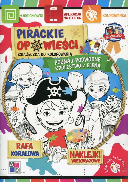Piraci, smoki, syreny, zaginione skarby, zaczarowane królestwo, dalekie wyprawy - jednym słowem piękna, klasyczna baśń, przygotowana pod okiem doświadczonego pedagoga, a ponadto: aplikacja na telefon, rozwijające intelekt łamigłówki oraz duża ilość przepięknych, wielorazowych naklejek, wspierających kreatywność i wyobraźnię dziecka, to seria edukacyjnych książeczek i kolorowanek ""Pirackie opowieści"".