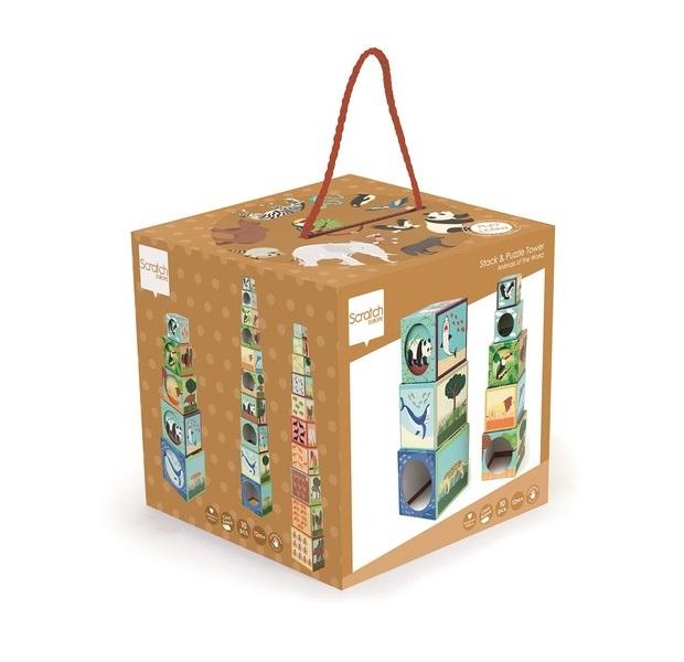Kolorowa wieża to zestaw składający się z 10 elementów do ułożenia. Każdy z nich jest w różnym rozmiarze. To wspaniała zabawa, ale też doskonałe narzędzie edukacyjne. Dziecko ma za zadanie ustawić piramidę z 10 kostek kolejno zaczynając od największej tak, aby tworzyła ona logiczny ciąg składający się ze zwierzątek. Dodatkowo elementy posiadają specjalne wycięcie, dzięki któremu po włożeniu jednego elementu w drugi widzimy obrazek. Zadaniem dziecka jest dopasować zwierzę do miejsca zamieszkania np: panda i las bambusowy