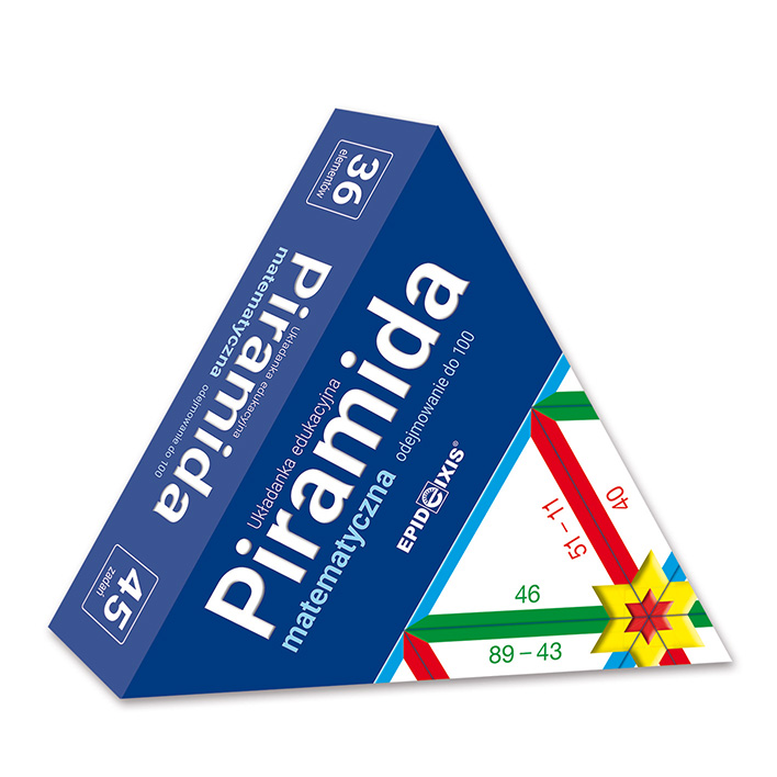 Piramida to wspaniała zabawa połączona z nauką, ponieważ rozwija u dziecka zdolność do myślenia i zapamiętywania, uczy wytrwałości, wzmacnia koncentrację i skutecznie pomaga przezwyciężyć trudności w procesie uczenia się. Budowanie piramidy jest proste i odbywa się na zasadzie gry w domino, w efekcie rozwiązania wszystkich zadań otrzymujemy imponującą piramidę. Piramida matematyczna M3 to nieoceniona pomoc, która dzięki swojej zabawowej formie służy poznawaniu podstaw techniki rachunkowej, utrwaleniu pojęcia liczby i odejmowania. Rozwiązywanie zadań nie służy pamięciowemu opanowaniu umiejętności liczenia. Jest raczej propozycją aktywnej nauki, opartej na kształceniu zdolności formułowania wniosków i samodzielnemu dochodzeniu do wyniku działania. Taki model uczenia się sprzyja stymulowaniu uzdolnień matematycznych u dzieci i wzmacnia ich odporność emocjonalną. Dzięki prawidłowemu rozwiązaniu 45 zadań dzieciom uda się stworzyć imponującą piramidę, która zrekompensuje wysiłek umysłowy poniesiony przy odejmowaniu. Zabawa i nauką z piramidą z pewnością przyniosą wymierne korzyści w szkole, domu i w przyszłym życiu codziennym. W zestawie znajduje się 36 trójkątów. Piramida jest rekomendowana przez logopedów, pedagogów i psychologów jako wartościowy materiał edukacyjno-terapeutyczny. Oferta tematyczna Piramid: Logopedyczna L1: ś – ź – ć – dź; Logopedyczna L2: b – p , d – t , w – f; Ortograficzna P1: zasady pisowni – ó, u, rz, ż, ch, h; Ortograficzna P2: zasady pisowni – wymienne; Matematyczna M1: dodawanie do 100; Matematyczna M2: tabliczka mnożenia; Matematyczna M4: dodawanie/odejmowanie do 100; Matematyczna M5: mnożenie/dzielenie do 100; Język angielski JA1: dla najmłodszych.