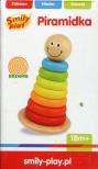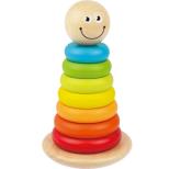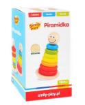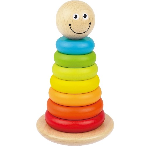 7 drewnianych, kolorowych krążków stojak typu wańka – wstańka Drewniana piramidka składa się z 7 kolorowych krążków, chwiejącej się przy poruszaniu podstawy typu wańka – wstańka, oraz śmiejącej się główki. Zabawa z piramidką rozwija umiejętności logicznego myślenia, koordynację ręka – oko, uczy rozpoznawania kolorów oraz pojęcia większy – mniejszy. Wykonana jest z wysokiej jakości drewna. Nie ma ostrych kształtów. Do produkcji zabawki użyto nietoksycznych farb.