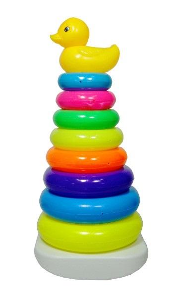 Wesoła, plastikowa piramidka z kaczuszką. Do sortowania i układania. . #&Rozwija zdolności motoryczne i wzrokowe malucha.#&Dla dzieci powyżej 12 miesiąca życia.#&Zapakowana woreczek z siatki.