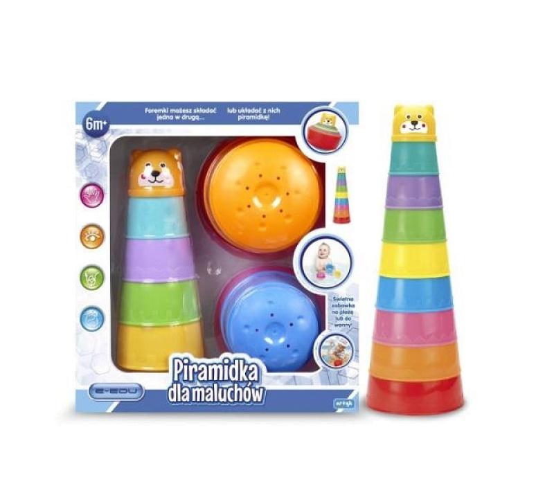 - Piramidka malucha to edukacyjny zestaw kolorowych kubeczków, które łączy zabawę z nauką.