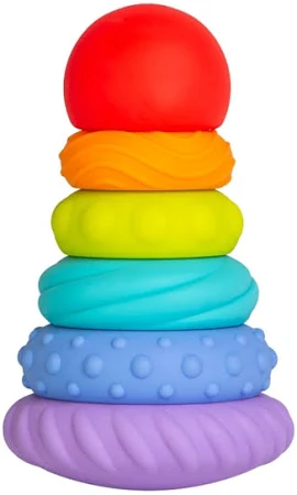 Ta sprytna zabawka balansuje, nakłada się i rozkłada co pobudza ciekawość dziecka i zachęca je do aktywnej, kreatywnej i edukacyjnej zabawy. 6 barwnych, przyciągających wzrok i będących okazją do nauki kolorów, pierścieni wykonanych w 100% z bezpiecznego silikonu spożywczego można nakładać na siebie i zdejmować. Różnorodne faktury poszczególnych pierścieni delikatnie masują dziąsła i przynoszą ulgę w trudnym okresie ząbkowania.