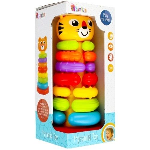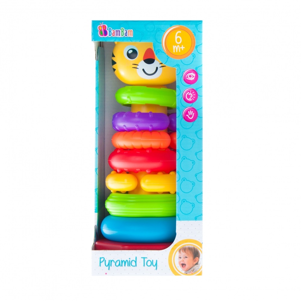 Tęczowe okręgi PIRAMIDKI TYGRYS doskonale sprawdzają się w pierwszym okresie nauki sortowania i ćwiczenia zdolności motorycznych. Układanie kaskadowe pierścieni, a następnie potrząsanie nimi dostarcza dziecku wielu radości i aktywizuje go do działania. Zróżnicowana faktura i nieregularna powierzchnia okręgów dodatkowo wzbogaca doznania dotykowe wpływając na intensyfikacje zmysłu dotyku. Intensywna kolorystyka elementów  oraz ich zróżnicowana tekstura stymulują zmysły na wielu płaszczyznach,  w tym  wzroku, percepcji. Zabawka doskonale rozwija wyobraźnię i zdolnonści poznawcze. Wymiary/waga/baterie: wymiary produktu (dł. x wys. x gł.)[cm]: 12x29x12, wymiary opakowania (dł. x wys. x gł.)[cm]: 13x29x13, waga produktu bez opakowania [kg]: 0,15 kg, waga produktu w opakowaniu [kg]: 0,27 kg, nie wymaga zasilania bateriami. Zabawka przeznaczona dla dzieci w wieku: 6m+. Pakowana w kartonik z otwartym okienkiem.