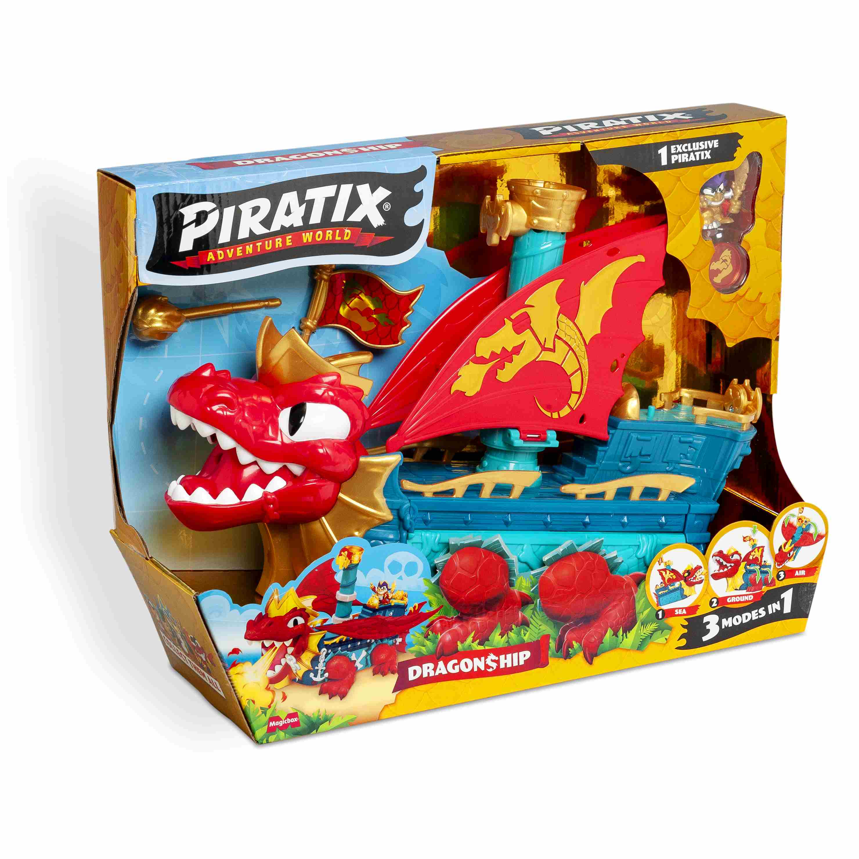 Miej oko na port! Przybywa Smoczy Statek, jedyny pojazd Piratix, który może poruszać się drogą lądową, morską i powietrzną: idealny sojusznik, aby zdobyć skarb Jungle Island!
