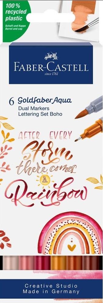Zestaw dwustronnych pisaków akwarelowych Goldfaber Aqua Faber-Castell w opakowaniu 6 szt. do handletteringu - boho. Zachwycają niezwykłą intensywnością kolorów oraz wszechstronnością zastosowania. Przy użyciu mokrego pędzla szkic lub motyw zaprojektowany za pomocą tych pisaków można zamienić w wspaniały obraz z efektem akwareli. Pozwalają na dużo bardziej precyzyjną pracę niż przy użyciu tradycyjnych farb akwarelowych. Doskonałe do wszelkich zastosowań kreatywnych i artystycznych. Każdy pisak ma dwie końcówki: miękką, elastyczną końcówkę pędzelkową do zadań artystycznych i cienką końcówkę 0,6 mm do konturów i detali. Tusz na bazie wody jest bezwonny i bezkwasowy, o neutralnym PH. Nie pozostawia smug i nie przecieka przez papier oraz jest w pełni rozpuszczalny w wodzie. Zatyczki i korpus są wykonane w 100% z materiału pochodzącego z recyklingu, w związku z czym mogą pojawić się niewielkie różnice kolorystyczne w częściach zewnętrznych.