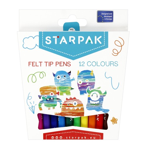 Intensywne kolory, długa żywotność, łatwe zmywanie ze skóry i spieranie z odzieży, wentylowana skuwka, odporna na wciśnięcia końcówka pisząca potwierdzają wysoką jakość produktu.STARPAK przedstawia 12 pisaków w intensywnych kolorach. Wymiary/waga Wymiary opakowania (dł. x wys. x gł.) (cm) 14x17x1, waga opakowania (kg.) 0,08kg. Pakowane w kartonik z zawieszką. Przeznaczone dla dzieci 3+.